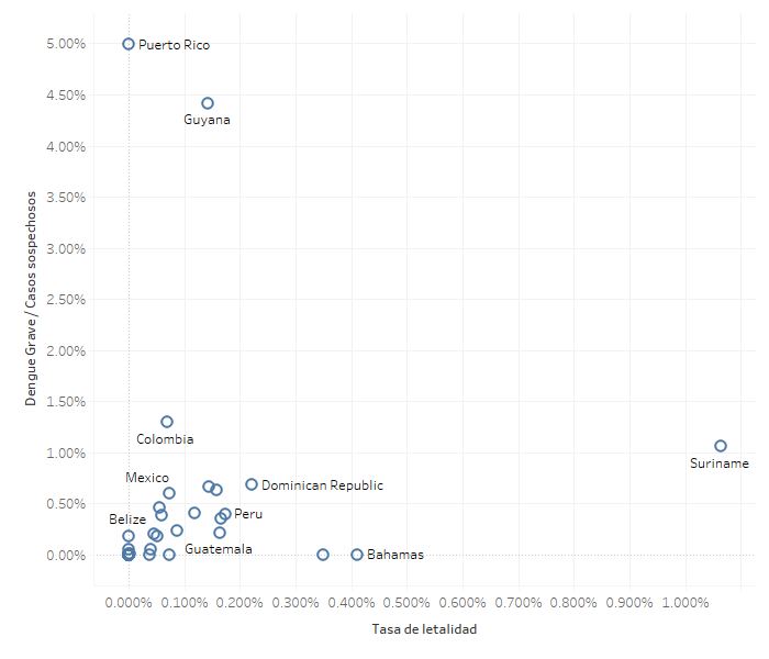 La gráfica 7 a continuación, muestra el diagrama de dispersión de dos variables que se utilizan para monitorear la gravedad de las temporadas de dengue: la tasa de letalidad de casos de dengue (la proporción de cuántos casos de dengue que mueren a causa del virus entre todos los casos de dengue) y la proporción de casos graves (casos graves de dengue entre todos los casos de dengue). Este diagrama de dispersión muestra visualmente cómo se correlacionan estas dos variables. En este esperaríamos ver una correlación positiva, eso significa que a medida que los países observan más casos graves, esperaríamos que una mayor proporción de estos casos muera.