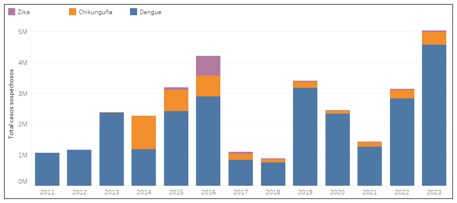 Resumen de la situación de arbovirusEn la Región de las Américas, entre las semanas epidemiológicas (SE) 1 y la SE 52 del año 2023, se notificaron un total de 5,027,493 casos de enfermedad por arbovirus. De estos, 4,578,274 (91.1 %) fueron casos de dengue, 411,560 (8.2 %) casos de chikunguña, y 37,659 (0.8 %) fueron casos de Zika. Los datos específicos de cada país sobre el recuento y la integridad de los casos se pueden encontrar en https://www.paho.org/es/arbo-portal El patrón de circulación de trece años de estos arbovirus se muestra en la (gráfica 1). La introducción de chikunguña en diciembre de 2013 se observa claramente en 2014. De manera similar, después de la introducción del Zika en 2015, hubo una circulación generalizada del virus en 2016. Sin embargo, la circulación del dengue ha continuado predominando. Gráfica 1. Distribución de casos notificados del dengue, el chikunguña y el Zika por año. Región de las Américas. 2011-2023