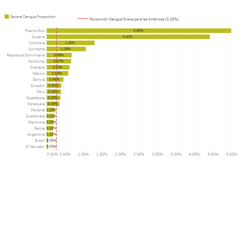La gráfica 5 describe la proporción de casos de dengue grave entre todos los casos de dengue notificados. 15 países han informado una mayor proporción de casos graves que la media regional de 0.20%. Los países que informaron la mayor proporción de casos graves entre el total de casos de dengue en 2023 fueron Suriname, (1.06%), Colombia, (1.3%), Guyana, (4.42%) y Puerto Rico, (4.99%) .