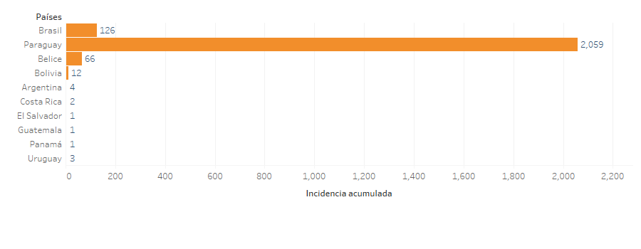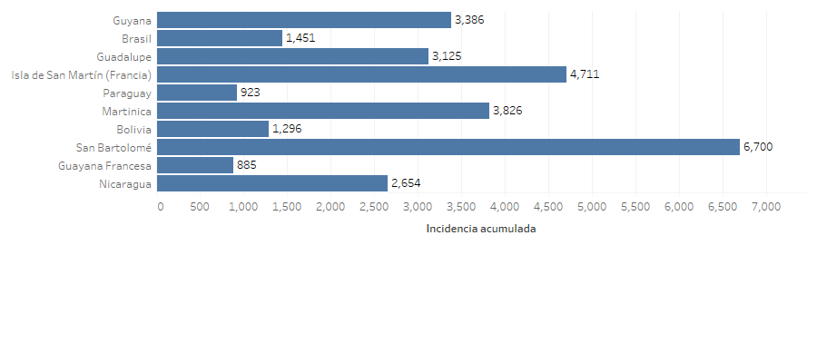 A la SE 52 del 2023, el mayor número de casos sospechosos de chikunguña en la Región fue reportado por Brasil, con 266,297 casos, lo cual representa (64.7 %) del total de casos de la región. Paraguay le sigue en el recuento de casos con 140,905 cases (34.2 %), seguido por Argentina con 1,746 casos (0.4 %), Bolivia con 1,468 casos (0.4 %), y Belice con 272 casos (0.1%). Los países con mayor incidencia acumulada se incluyen en la gráfica 10.
