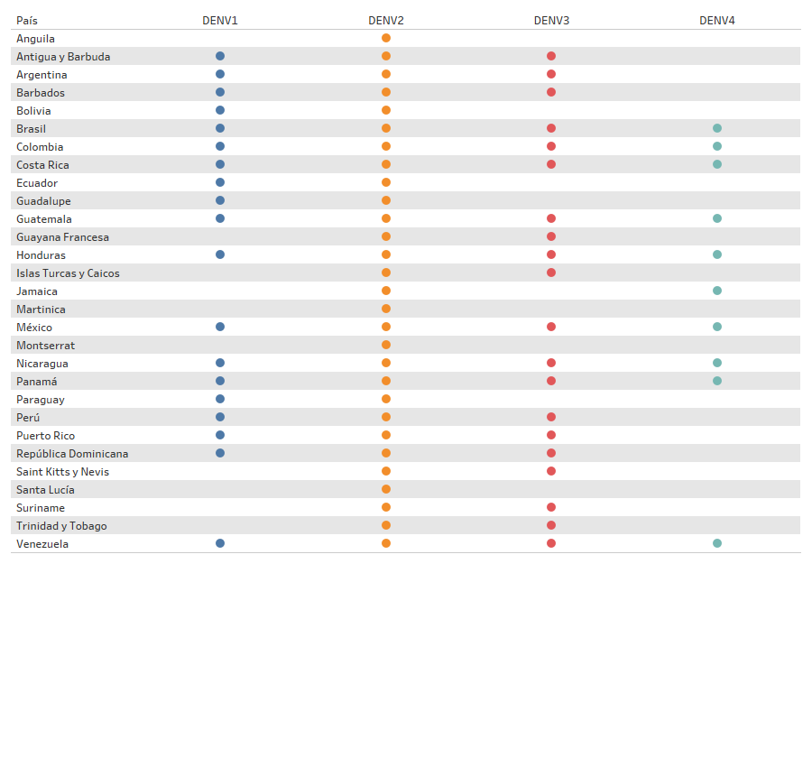 Los cuatro serotipos del virus del dengue (DENV 1, DENV 2, DENV 3 y DENV 4) estuvieron presentes en la Región de las Américas en el 2023. Brasil, Colombia, Costa Rica, Guatemala, Honduras, México, Nicaragua, Panamá y Venezuela notificaron la circulación simultánea de los cuatro serotipos en el 2023. La circulación del serotipo del dengue por país se detalla en la gráfica 8.
