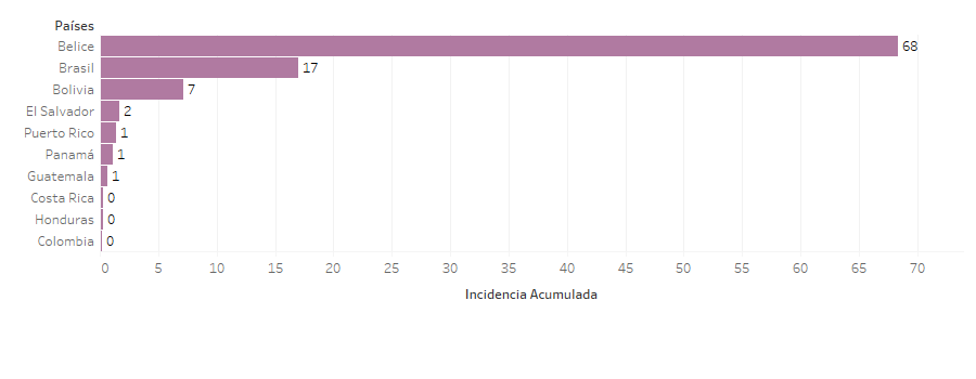El mayor número de casos de Zika en la Región se registró en los siguientes países: Brasil con 35,962 casos (95.5 %), Bolivia con 881 casos (2.3 %), Belice con 281 casos (0.7 %), Colombia con 116 casos (0.3 %) y Guatemala con 112 casos (0.3 %) de los casos de la región. Los cinco países con mayor incidencia acumulada se incluyen en la gráfica 12.