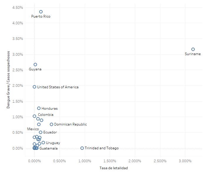 La gráfica 7 a continuación, muestra el diagrama de dispersión de dos variables que se utilizan para monitorear la gravedad de las temporadas de dengue: la tasa de letalidad de casos de dengue (la proporción de cuántos casos de dengue que mueren a causa del virus entre todos los casos de dengue) y la proporción de casos graves (casos graves de dengue entre todos los casos de dengue). Este diagrama de dispersión muestra visualmente cómo se correlacionan estas dos variables. En este esperaríamos ver una correlación positiva, eso significa que a medida que los países observan más casos graves, esperaríamos que una mayor proporción de estos casos muera.