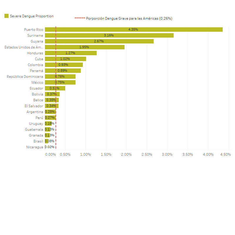 La gráfica 5 describe la proporción de casos de dengue grave entre todos los casos de dengue notificados. 16 países han informado una mayor proporción de casos graves que la media regional de 0.18%. Es de destacar que los países que informaron la mayor proporción de casos graves entre el total de casos de dengue en 2024 fue de Cuba, (1.02%), Honduras, (1.27%), Estados Unidos de América, (1.95%), Guyana, (2.67%), Suriname, (3.16%), Puerto Rico, (4.35%) .