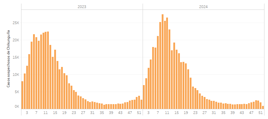 Entre la SE 1 y la SE 52 del 2024, se notificaron un total de 431417 casos de chikunguña en 17 de los 52 países y territorios de la Región de las Américas, de los cuales 232586 fueron confirmados (53.9 %). La incidencia regional acumulada de chikunguña en el 2024 fue de 43.46 casos por 100.000 habitantes. La tasa de crecimiento de la curva para 2023 fue de 181%, entre la SE 1 hasta el pico de la SE 12 , mientras que la tasa de crecimiento de la curva para 2024 fue de 296% , entre la SE 1 hasta el pico de la SE 9. La transmisión máxima fue en la SE 12 para el 2023 y en la SE 9 para el 2024, 245 decesos fueron reportados asociado con la infección por chikunguña.
