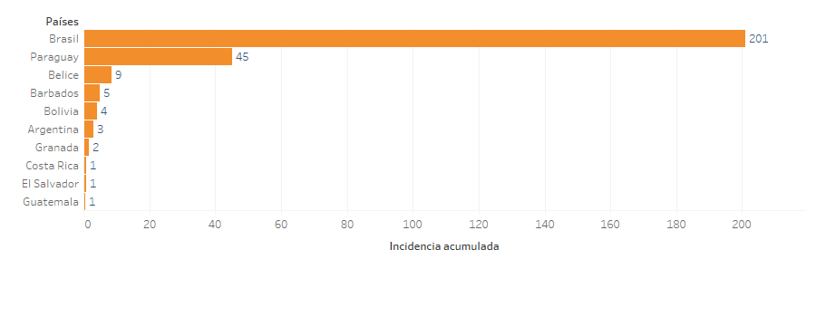 El mayor número de casos de Zika en la Región se registró en los siguientes países: Brasil con 43,234 casos ( 97.2 %), Argentina con 564 casos ( 1.3 %), Bolivia con 267 casos ( 0.6 %), Colombia con 117 casos ( 0.3 %), y El Salvador con 92 casos ( 0.2 %) de los casos de la región. Los cinco países con mayor incidencia acumulada se incluyen en la gráfica 12.