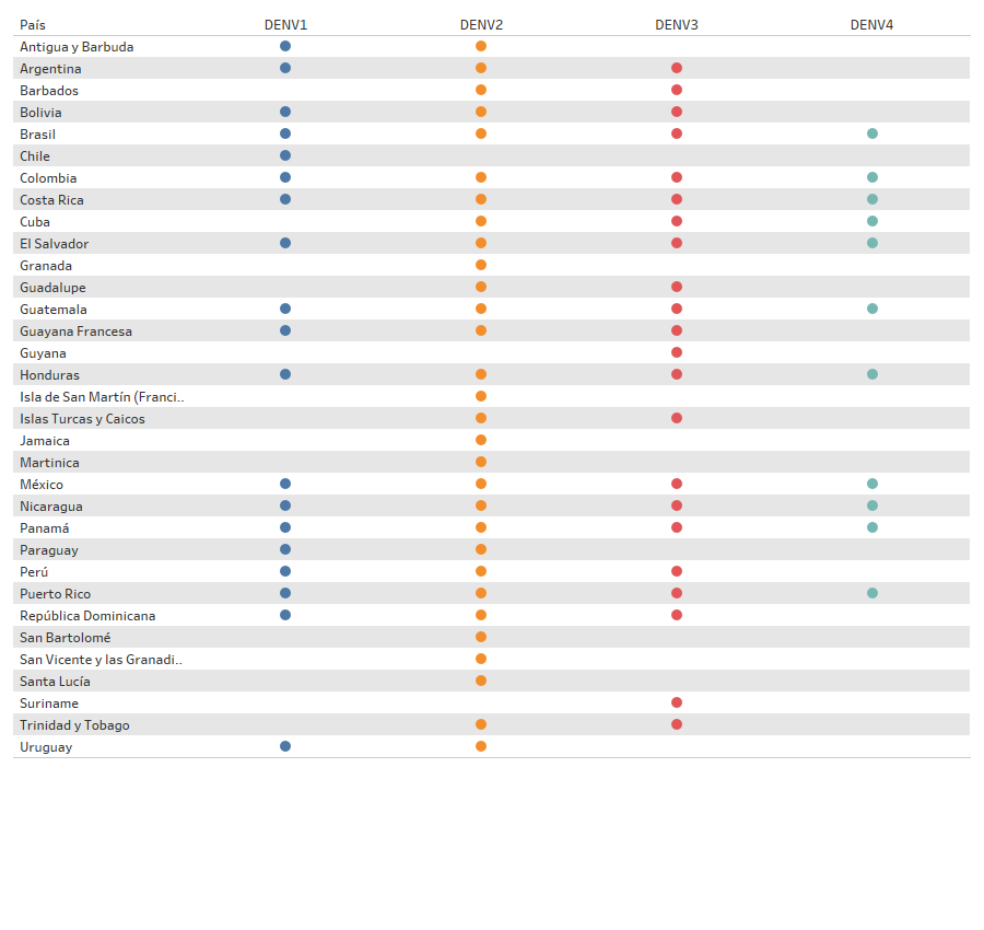 Los cuatro serotipos del virus del dengue (DENV 1, DENV 2, DENV 3 y DENV 4) estuvieron presentes en la Región de las Américas en el 2024. Brasil , Colombia , Costa Rica , El Salvador , Guatemala , Honduras , México , Nicaragua , Panamá , Puerto Rico notificaron la circulación simultánea de los cuatro serotipos en el 2024. La circulación del serotipo del dengue por país se detalla en la gráfica 8.